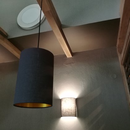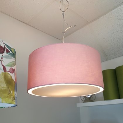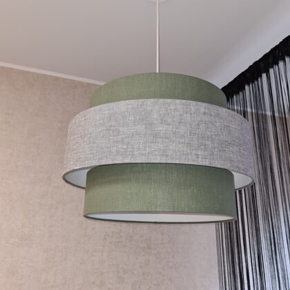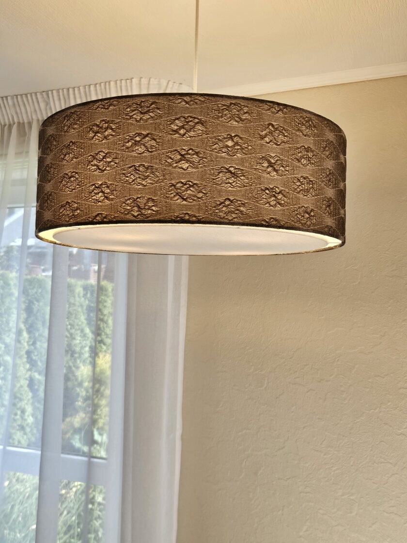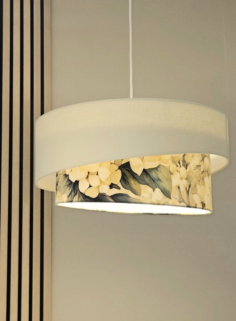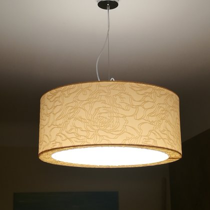 Griestu lampa D45 cm ar lina audumu ārpusē un printa audumu iekšpusē -
