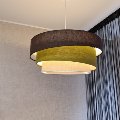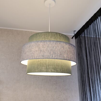 Slaidā griestu lampa ar ārējo metāla kupolu un lina auduma abažūru -