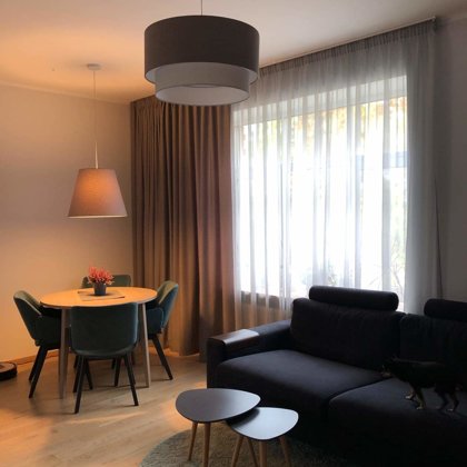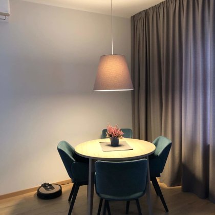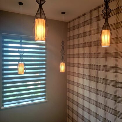 ''Zirneklīša" lampa virs ēdamgalda, linu audumi -