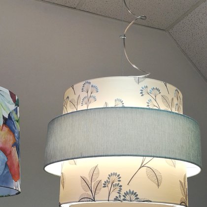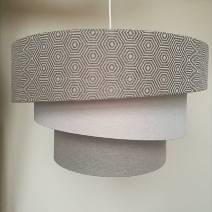 Liela divpusējā "tortītes" lampa, izmantoti divi audumi katrā no līmeņiem. Lampas D70 cm -