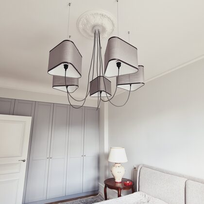 Pušķu lampa ar 5 abažūriem augstiem griestiem -