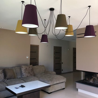 Kombinētā griestu lampa 4,5m augstiem un ieslīpiem griestiem, ar 9 abažūriem -
