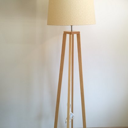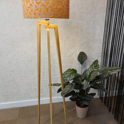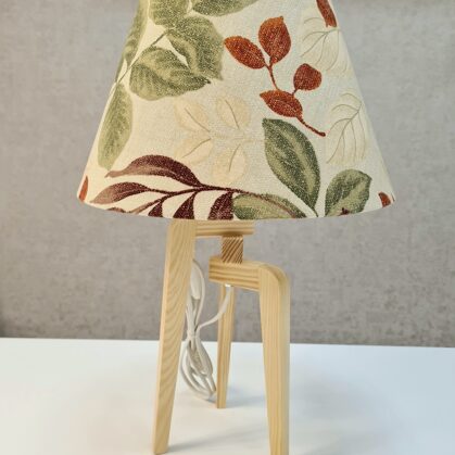 Gaiša koka stāvlampa ar printa auduma abažūru dabas mīļiem. -