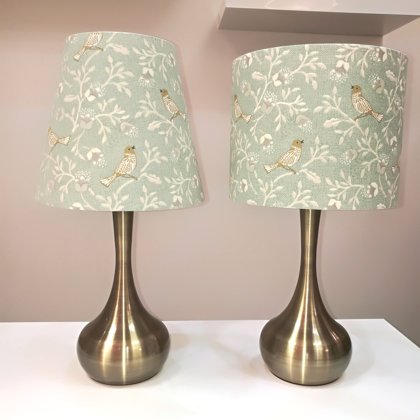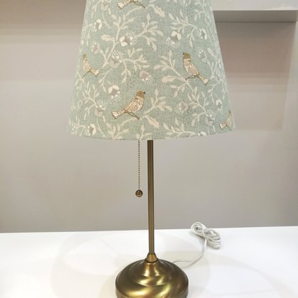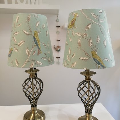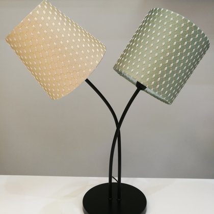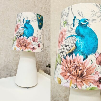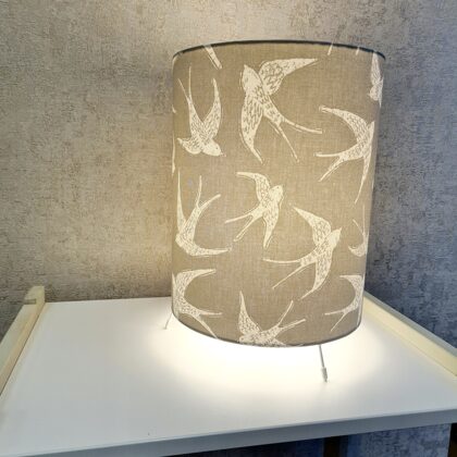 Zirneklīša lampa ar divpusējiem abažūriem, linu audumi +printu audums ar putniem -