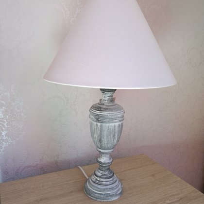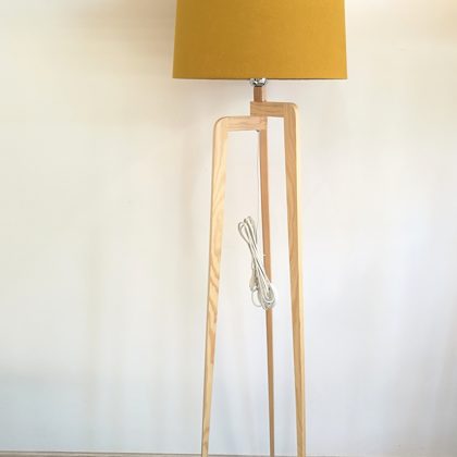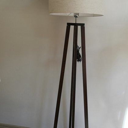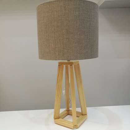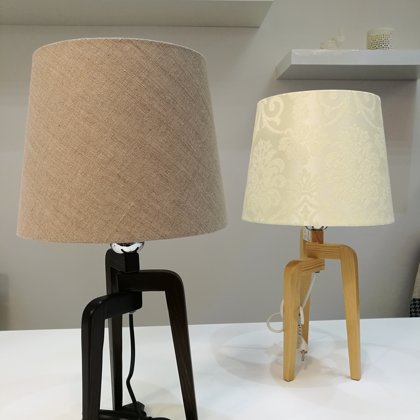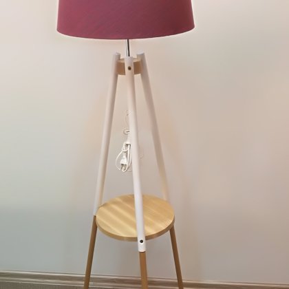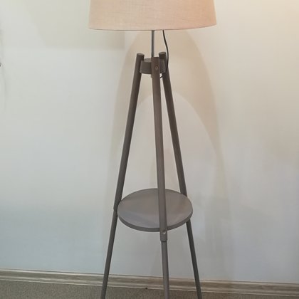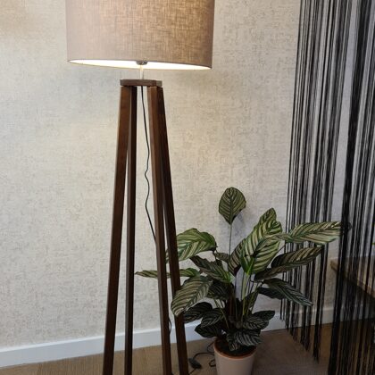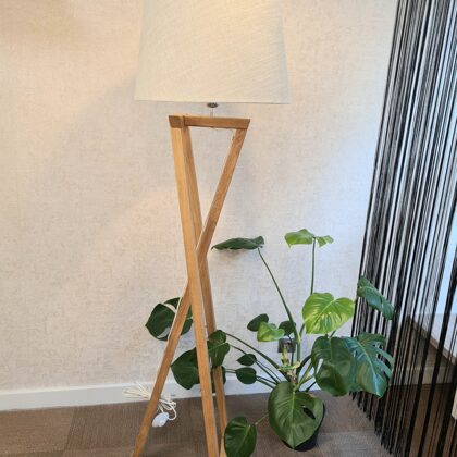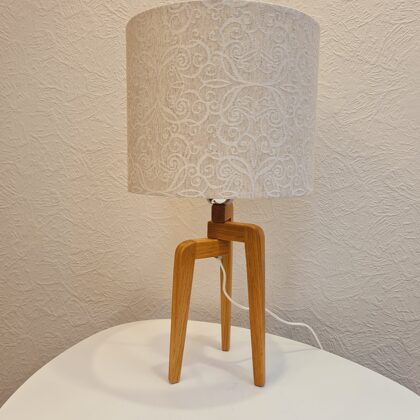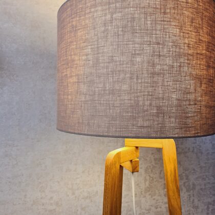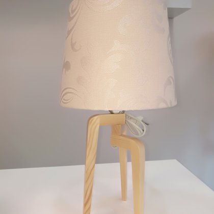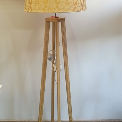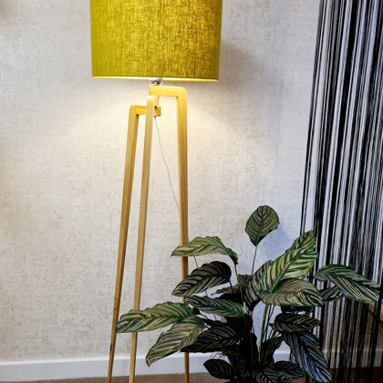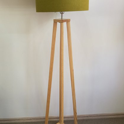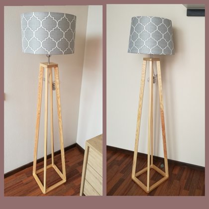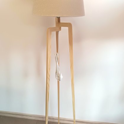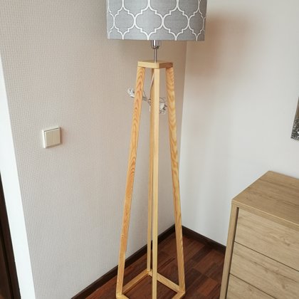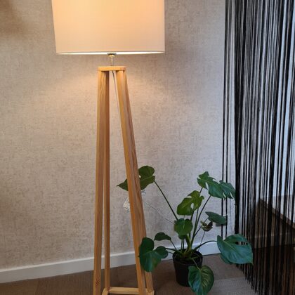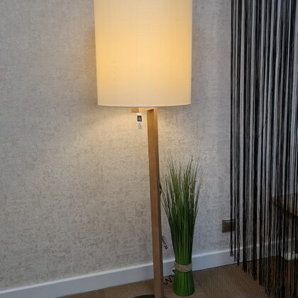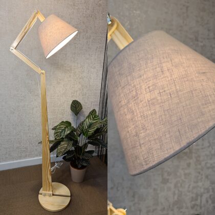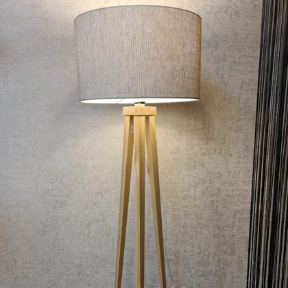 Gaiša priedes koka stāvlampa ar greznu auduma abažūru. -