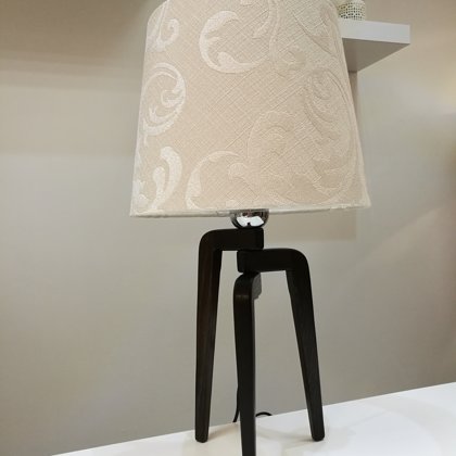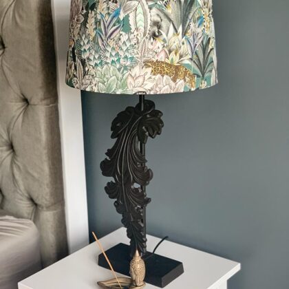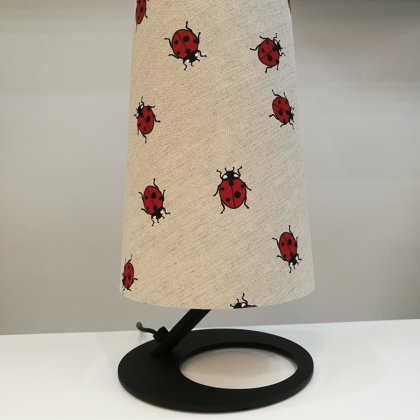 Melna koka stāvlampa ar printa auduma abažuru ar jaukām ķirzaciņām dzīvoklim Tenerifē, D40 -