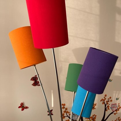 ''Zirneklīšu" lampa ar 5 dažāda lieluma abažūriem no dažādu krāsu linu audumiem -
